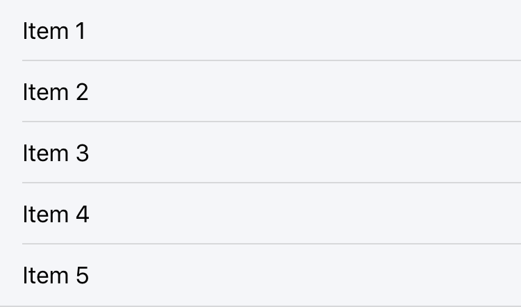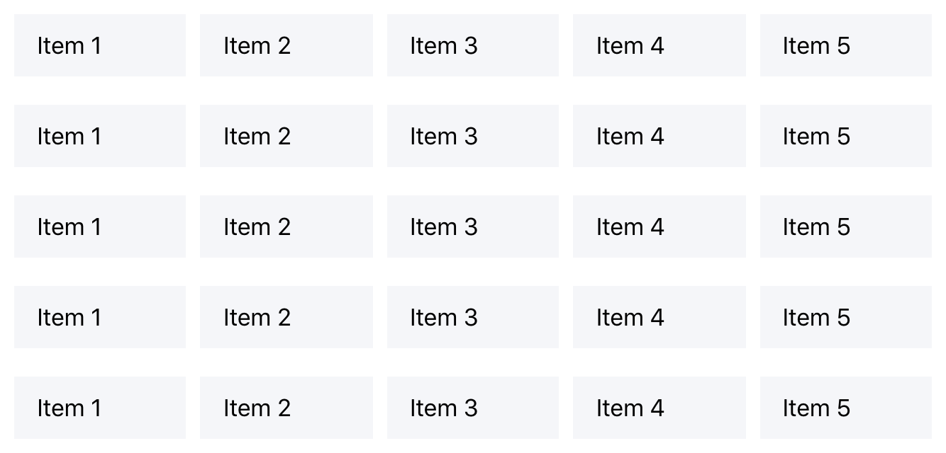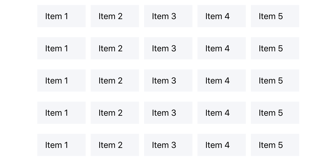 This will render 5 items with a width of 100% each. This may look great on a mobile device, as seen below, but viewing this on a desktop browser is a different story. The items become stretched to fill the entire screen because of the wide screen width, leaving screen space unused.